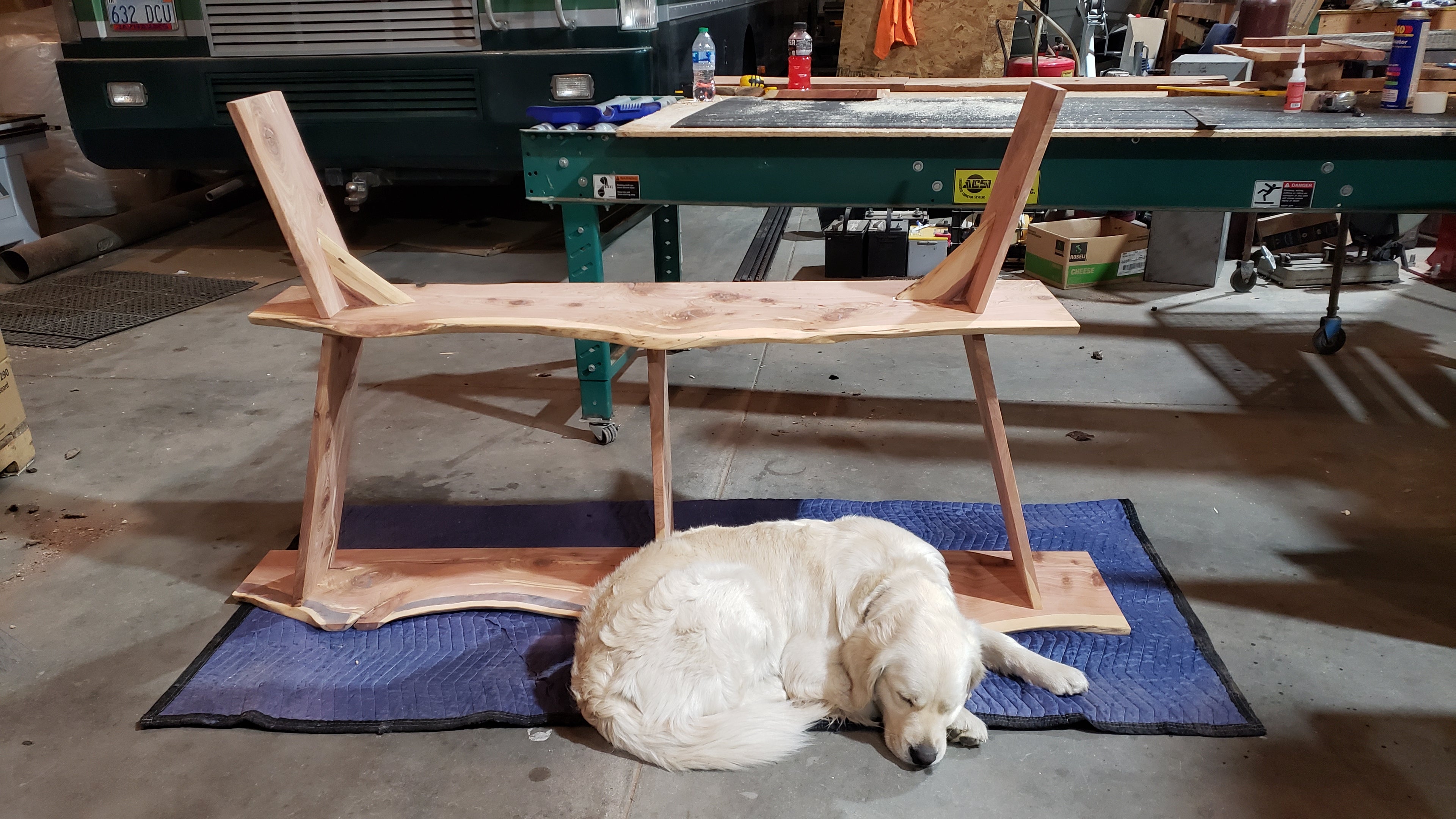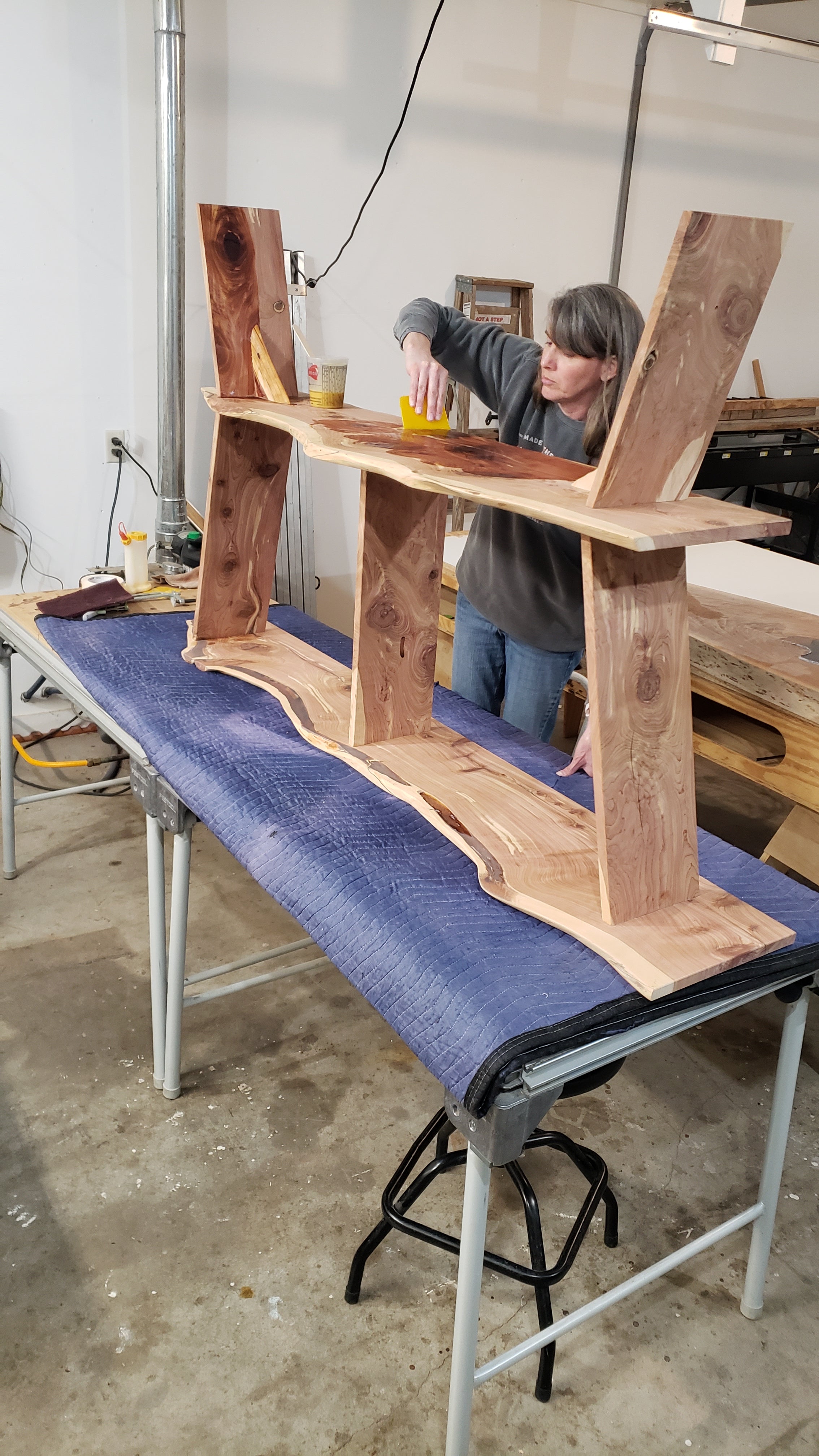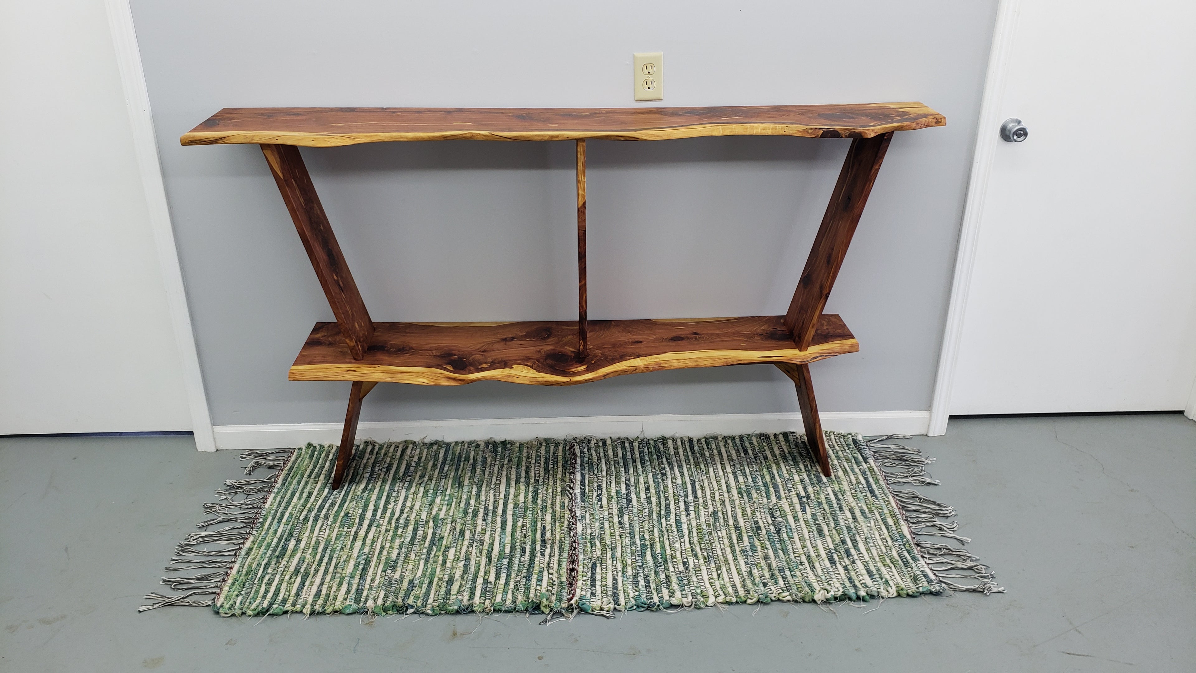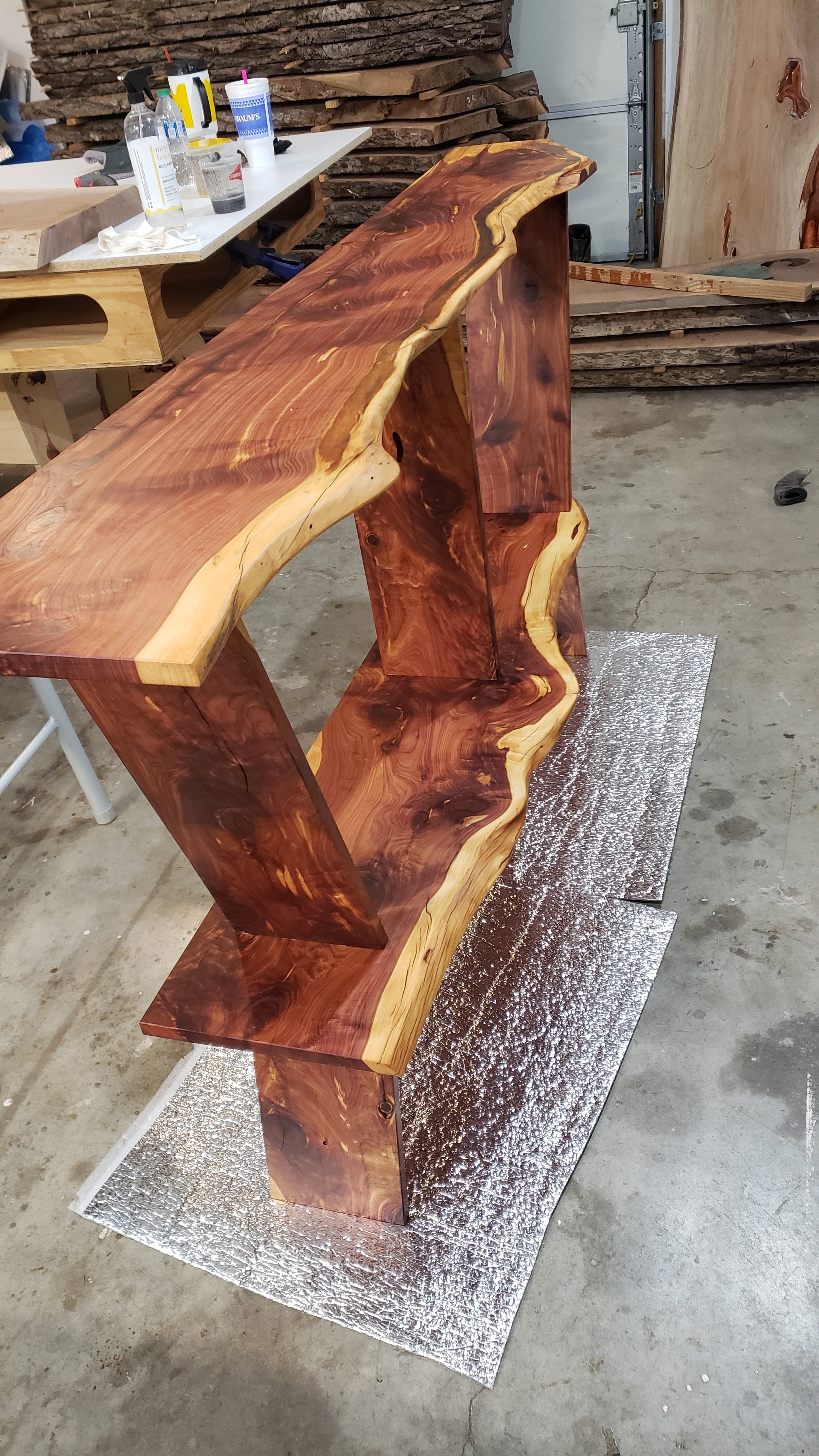 This beautiful design was brought to us by our customer. The lumber had been milled decades ago from a cedar tree on their family farm. With no extra lumber to spare the pieces were carefully laid out to show off the live edges and grain patterns. The distressed lumber was stabilized, sanded, and finished with Rubio Monocoat for a durable, beautiful, and natural look.