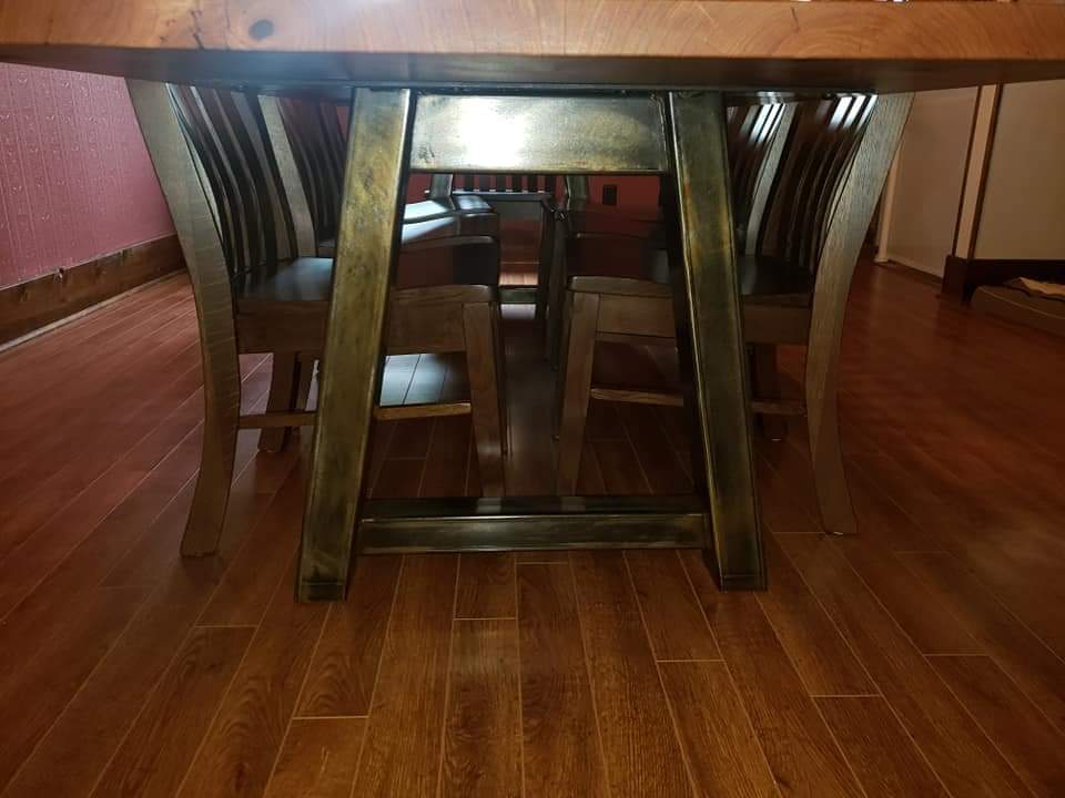 Two live edge slabs were glued up to make the table top and I fabricated a large tube steel freestanding base. The fine grain of the cherry wood becomes even more beautiful with age and pairs perfectly with the natural patina finish used on the base.