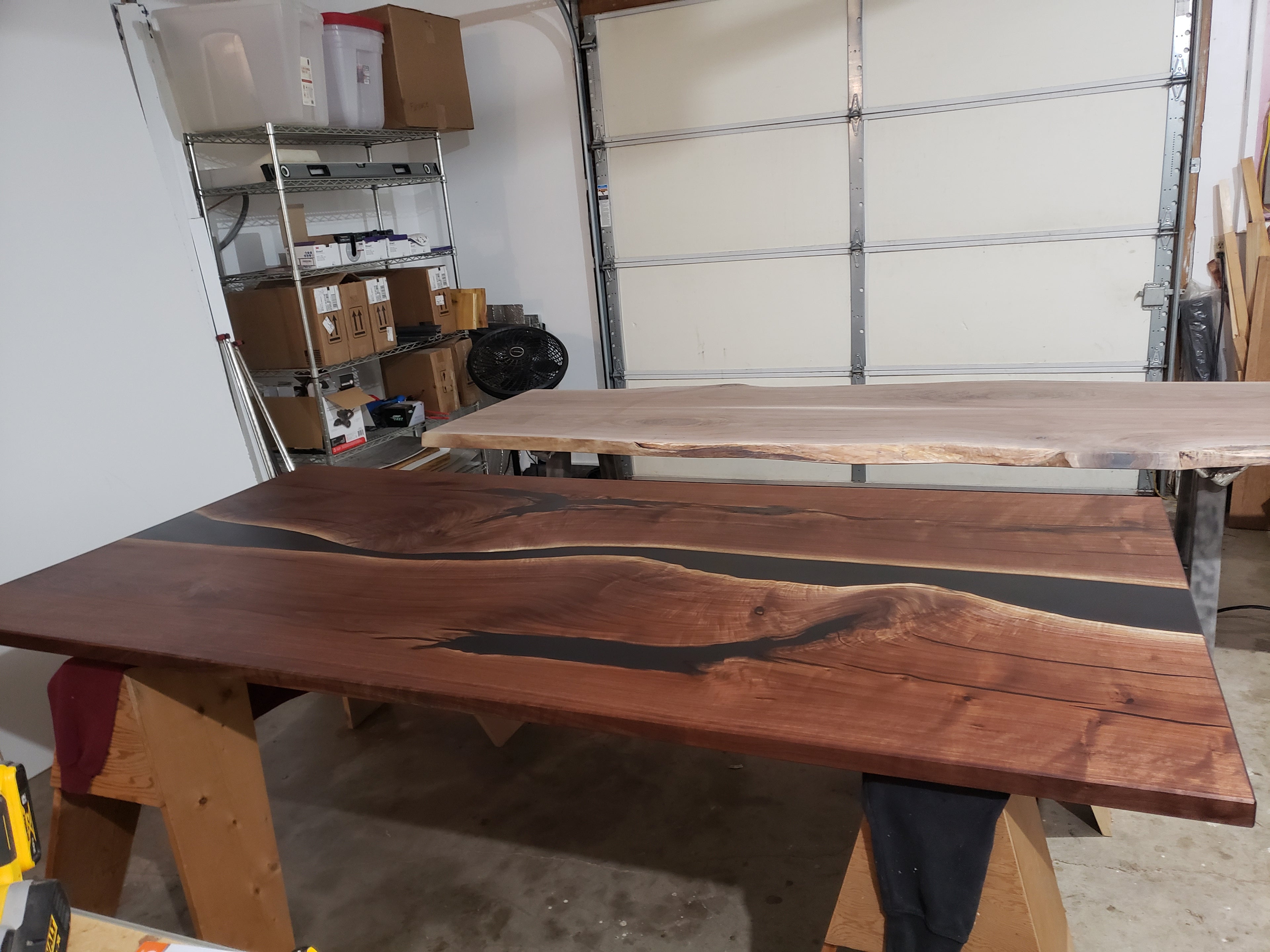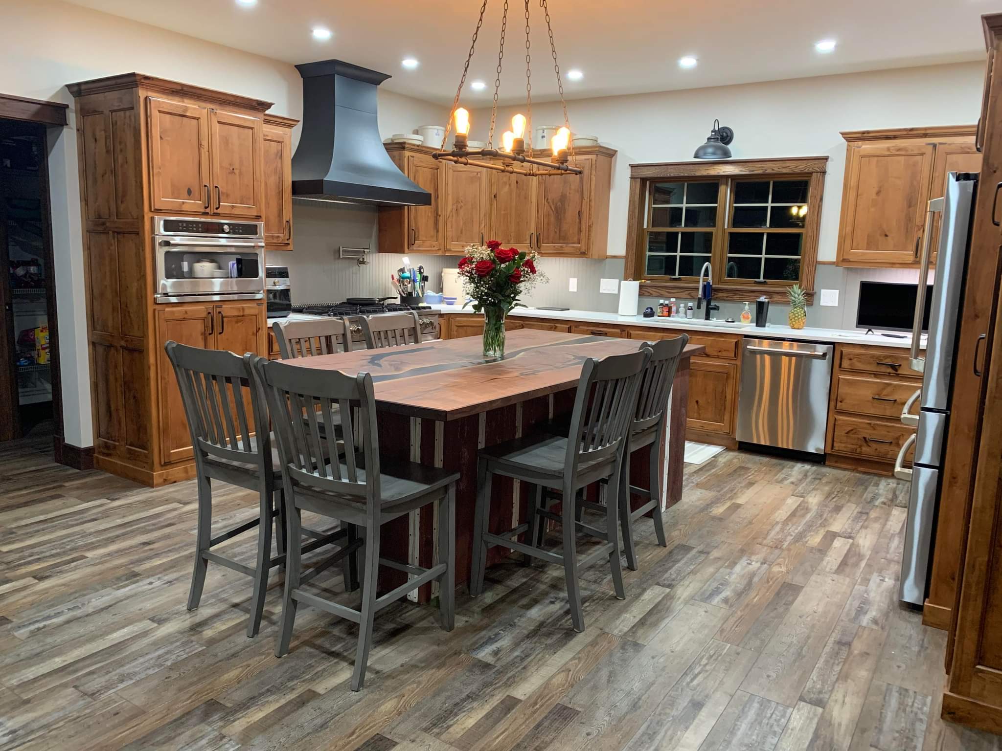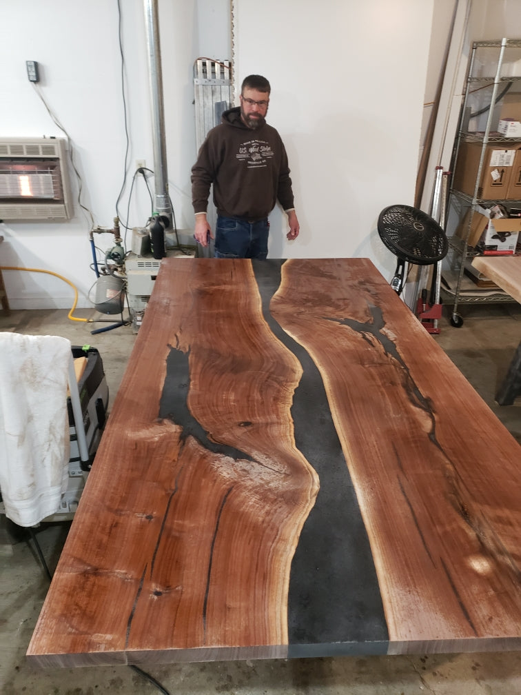 Commissioned for a beautiful new country home on an amazing property , this large 4' x 8' walnut kitchen island provides plenty of room for everyone in the family. The live edges of these walnut slabs pair beautifully to create the banks of the black river running down the center of the table. The base is sided with reclaimed barnwood with rustic texture only decades of weathering can provide. Together the walnut top combined with the barnwood base are perfect for a growing family in a new home on a generational farm