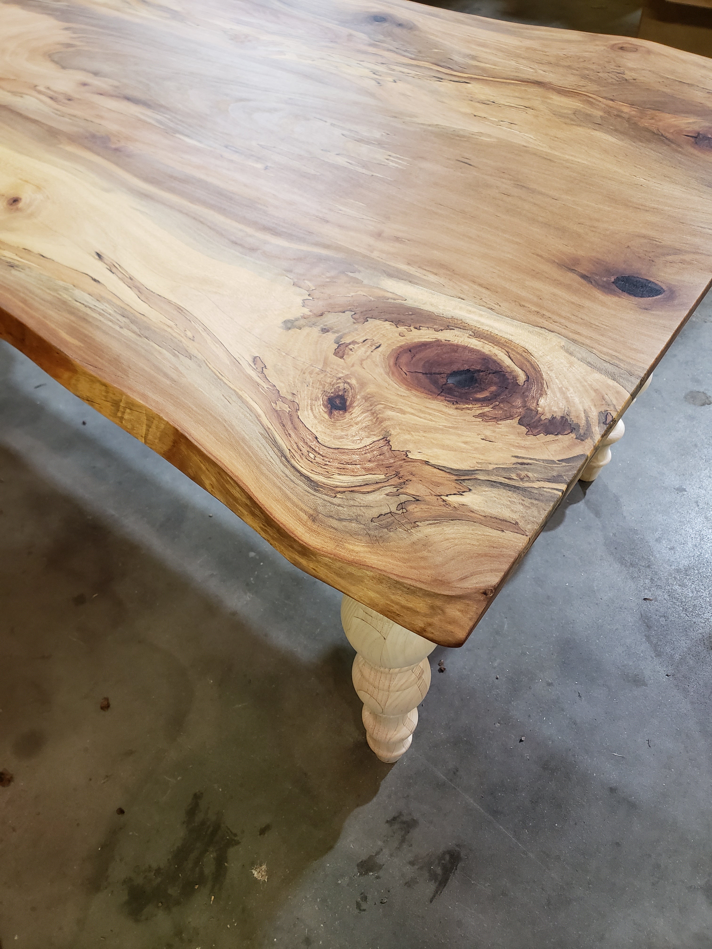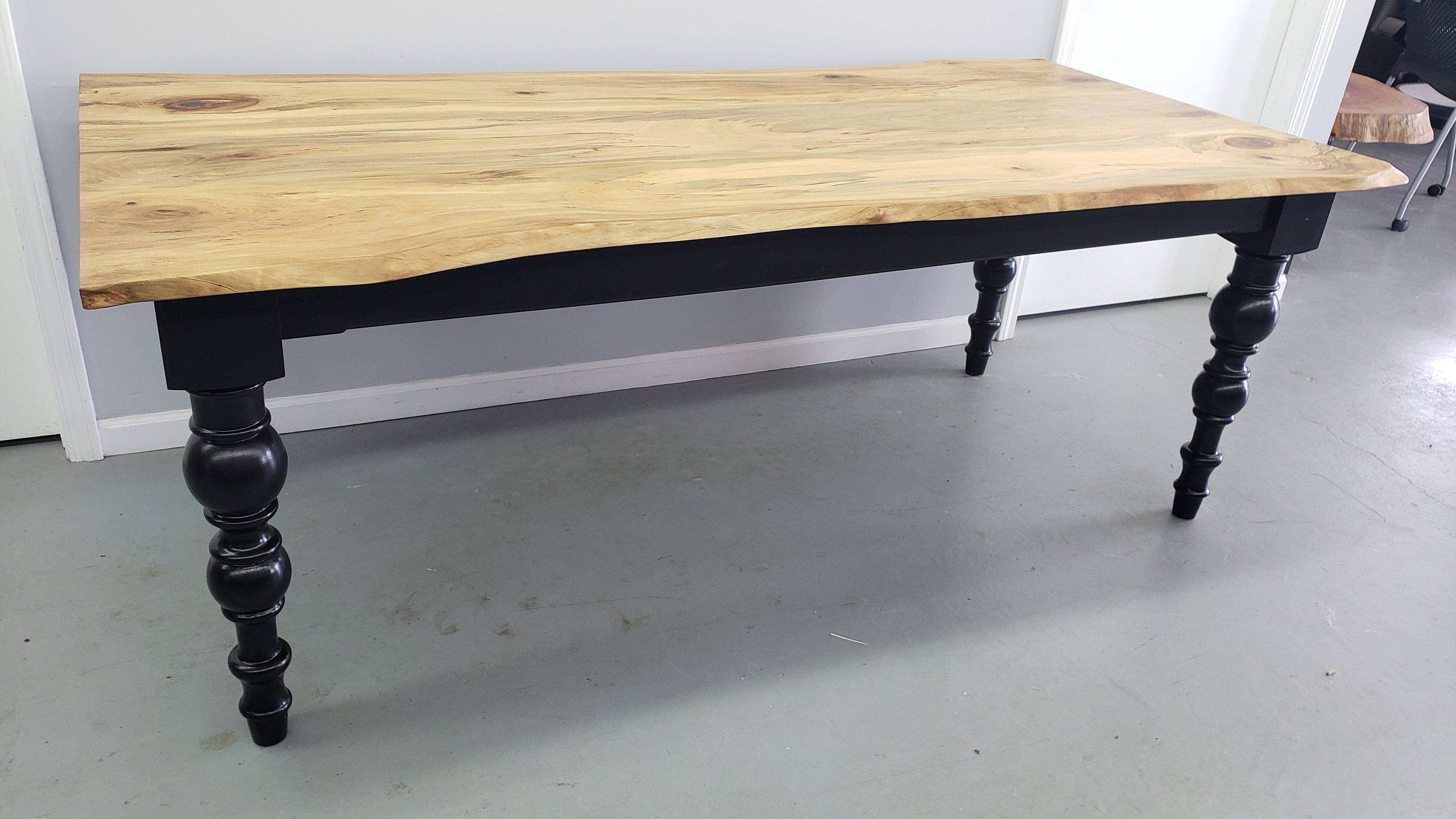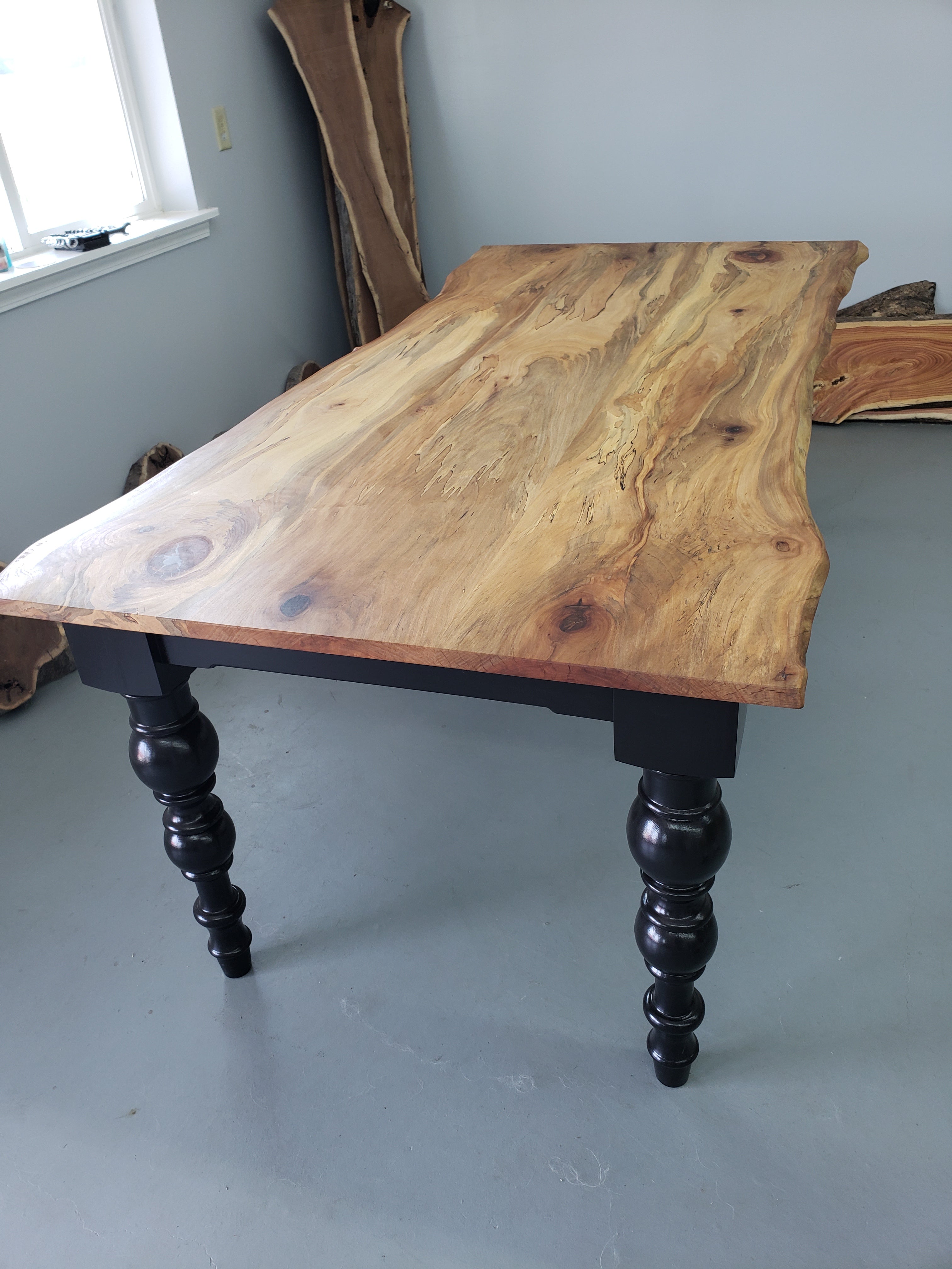 farmhouse table with more uniqueness or beauty pound for pound. Featuring live edges with lot's of interest, ample spalt lines and colors, and a caviar base with turned wooden legs this table is a winner!