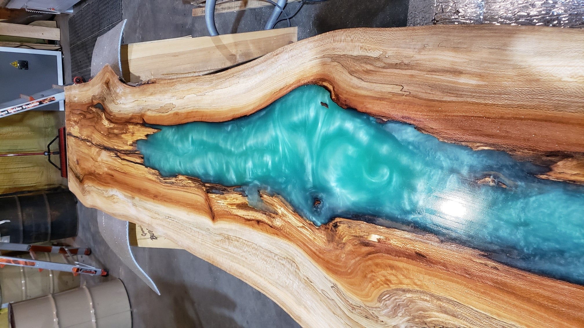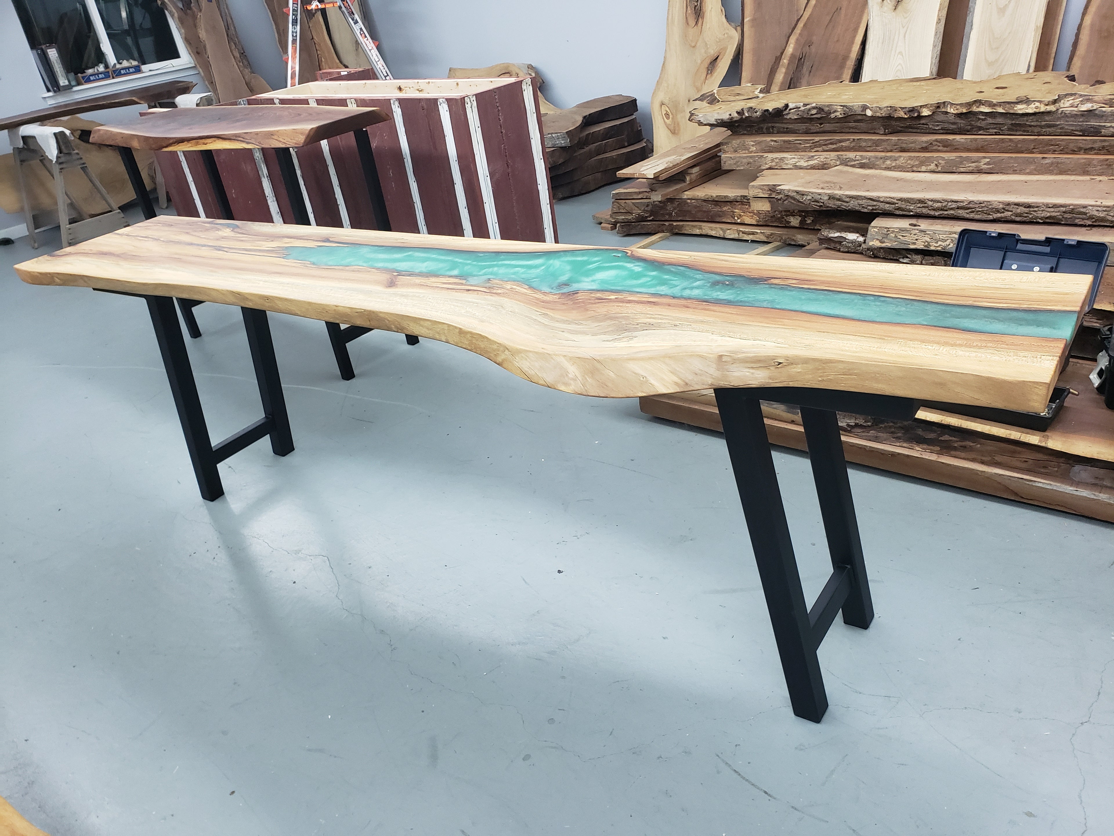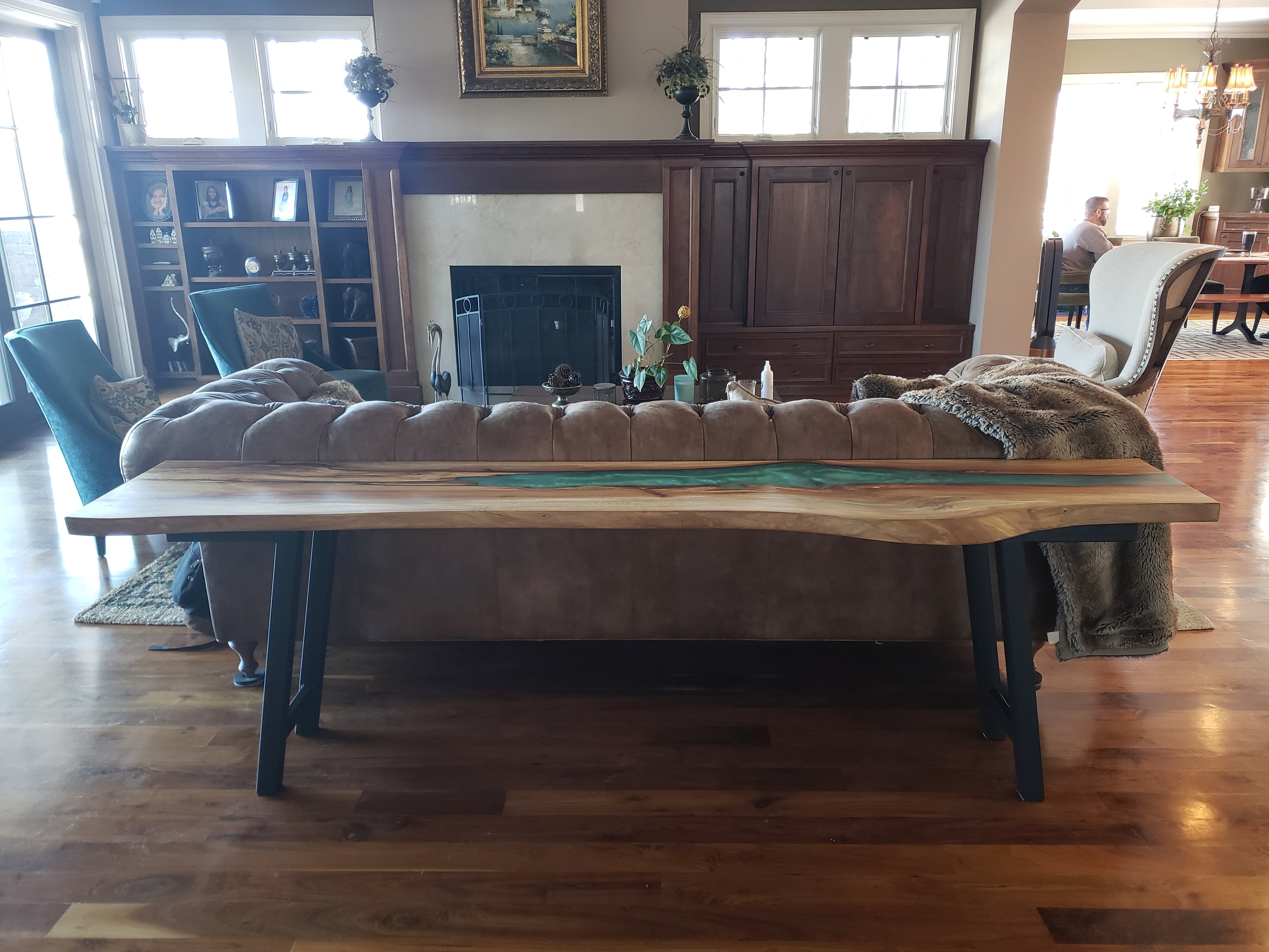 This spalted sycamore sofa table was commissioned by some close friends to be an accent piece in their beautiful mountain home. Custom designed for their space, the live edge top sits on in house designed and fabricated steel legs. The turquoise epoxy beautifully compliments the colors in their home and the colors in the sycamore provide a striking focal point when entering the front door.