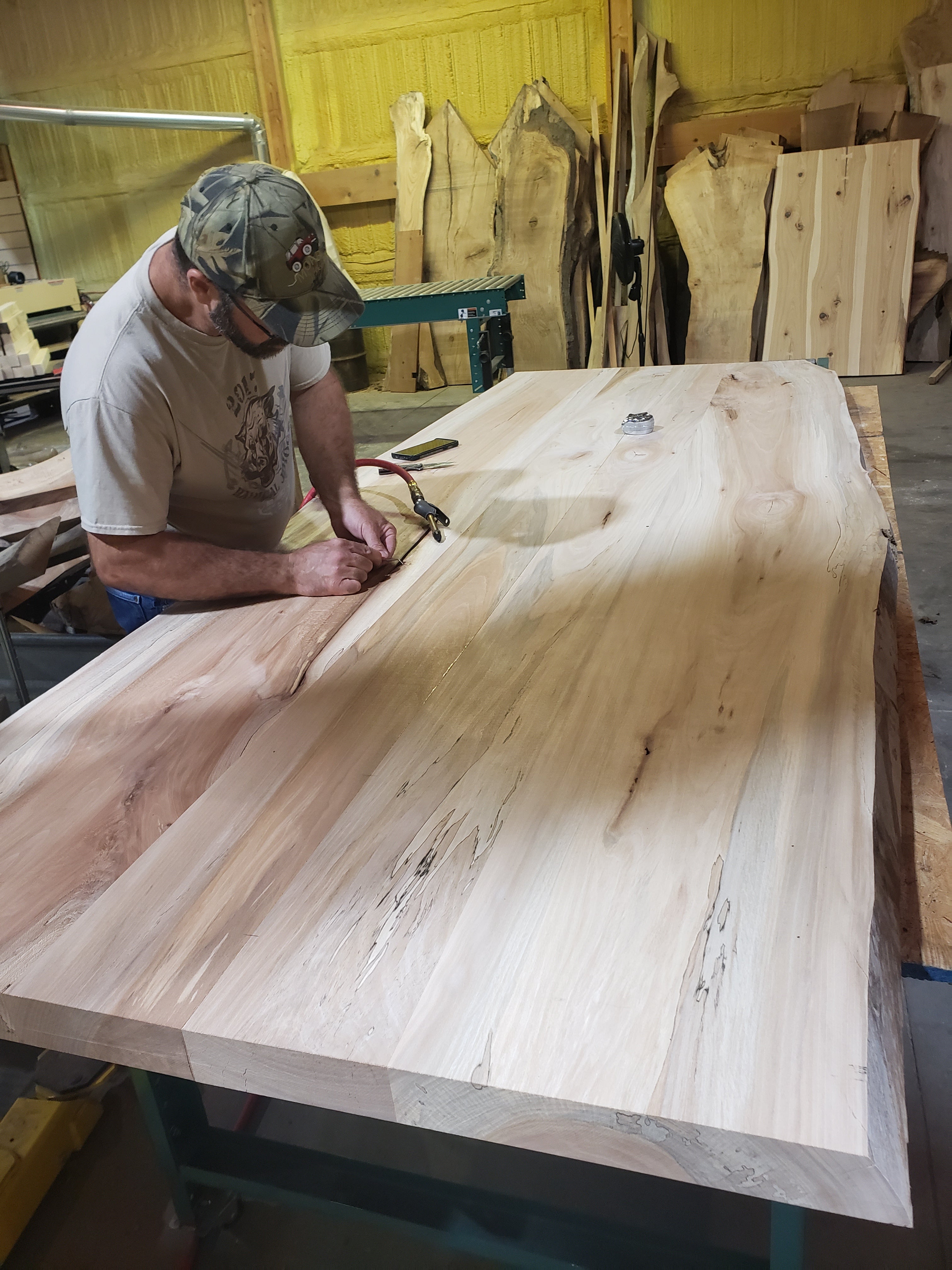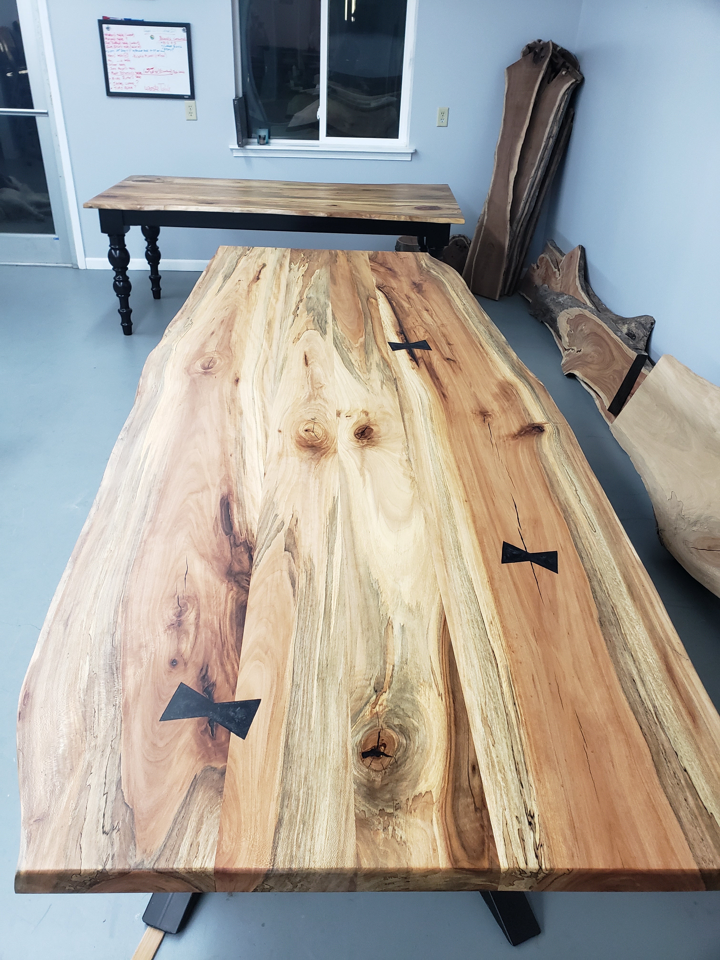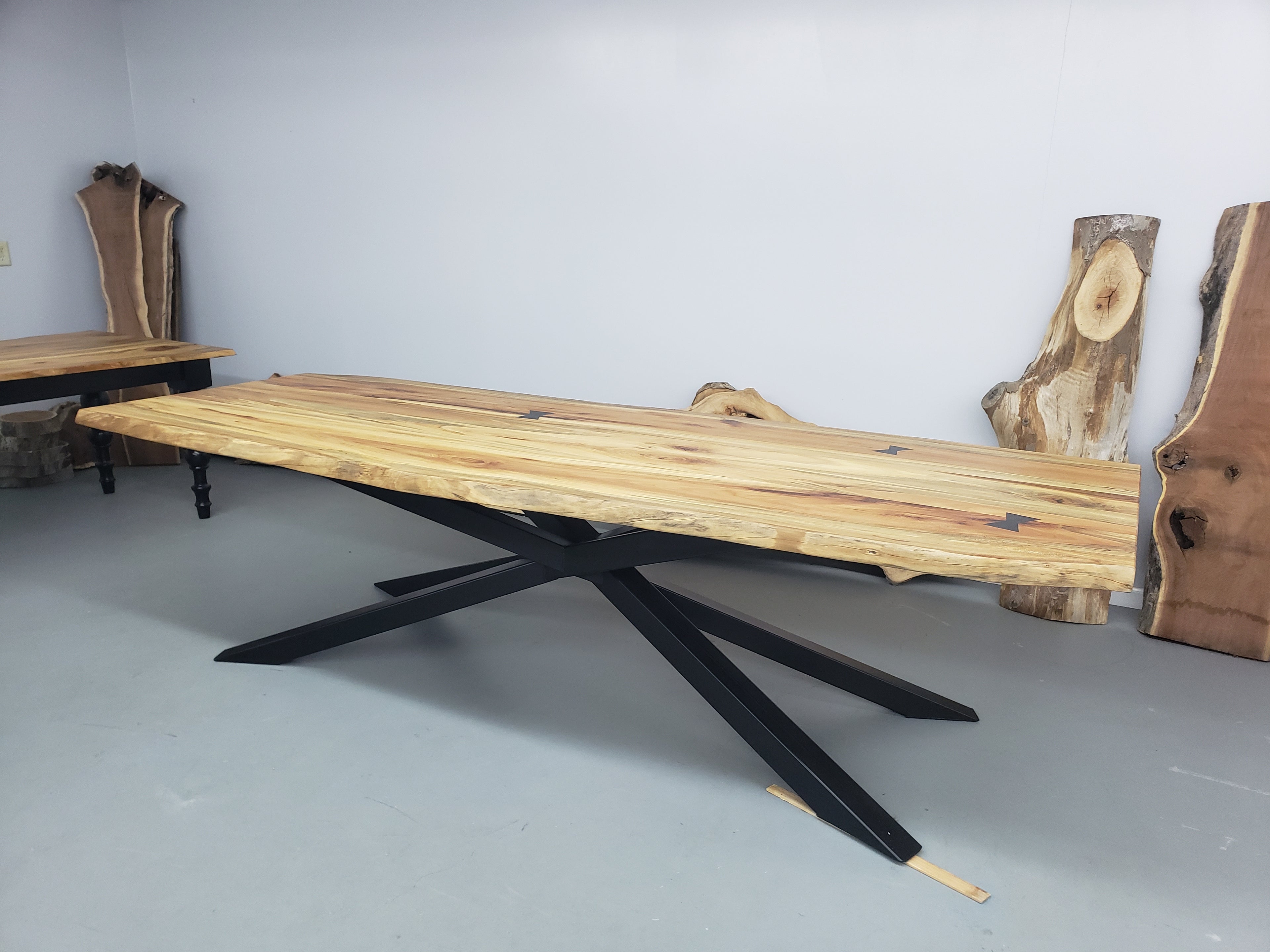 I love the oblong shape of this live edge spalted sycamore table and I love the crisscross tubular steel base that we fabricated in house. This beautiful table and base are heavy which had me a little concerned about delivery, but the delivery went perfectly. In its new home the table fits the space perfectly and looks like it is exactly where it is supposed to be.